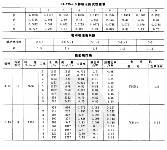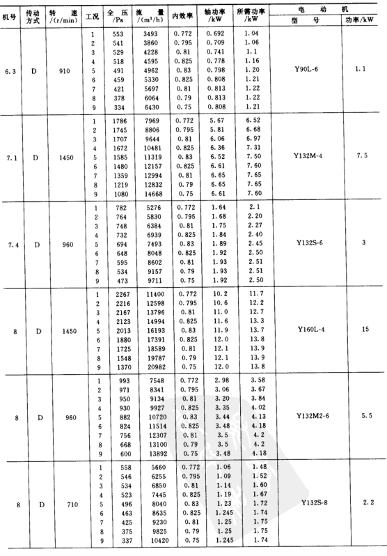 1)本風(fēng)機為單吸入風(fēng)機,機號有No.3.15、3.55、4、4.5、5、5.6、6.3、7.1、8、9、10、11.2、12.5、14等共14個機號組成。