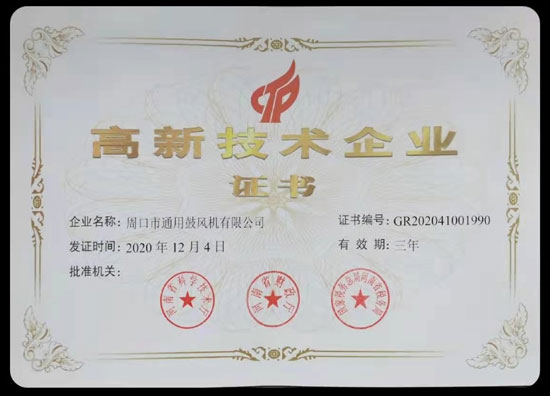 2020年12月4日,經國家稅務總局河南省稅務局、河南省財政廳、河南省科學技術廳認真評審,周口市通用鼓風機有限公司順利榮獲“高新技術企業(yè)”證書。這是政府及社會各界對公司的認可,我們將以此為動力,努力的打造"周口風機”品牌,生產出更好的產品來回饋客戶!