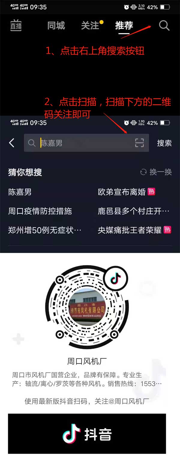 方法一:打開抖音發(fā)現(xiàn)界面,再點(diǎn)擊“掃一掃”功能。掃描下方的周口風(fēng)機(jī)廠抖音二維碼,系統(tǒng)會(huì)直接打開周口風(fēng)機(jī)廠抖音賬號(hào)詳情頁面,直接點(diǎn)擊關(guān)注(如圖所示)。