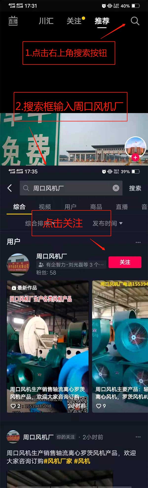 方法二:打開抖音APP,在右上角搜索欄輸入:周口風(fēng)機(jī)廠,或者輸入抖音號(hào):97903992377。